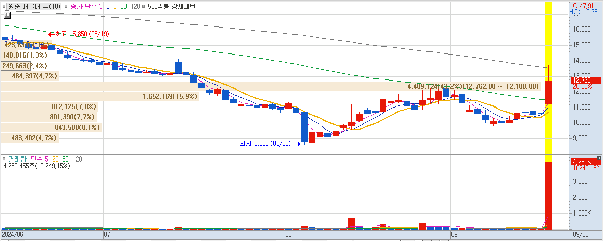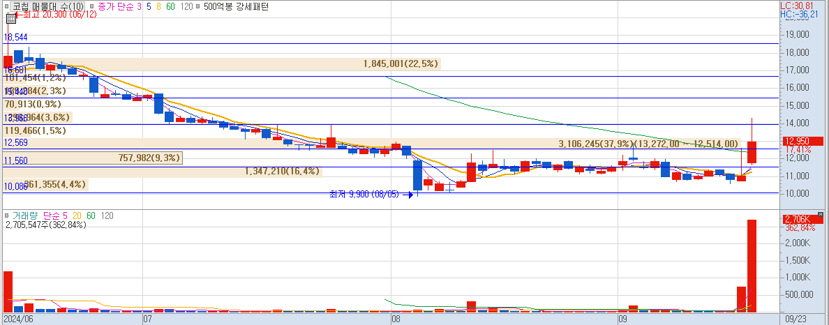 - 경영권 분쟁 이슈로 연속 상한가를 기록. 상한가 종가 부근을 지켜내며 반등하는 모습을 보였음. 이런 지지 구간에서 매매 기회를 포착할 수 있습니다.