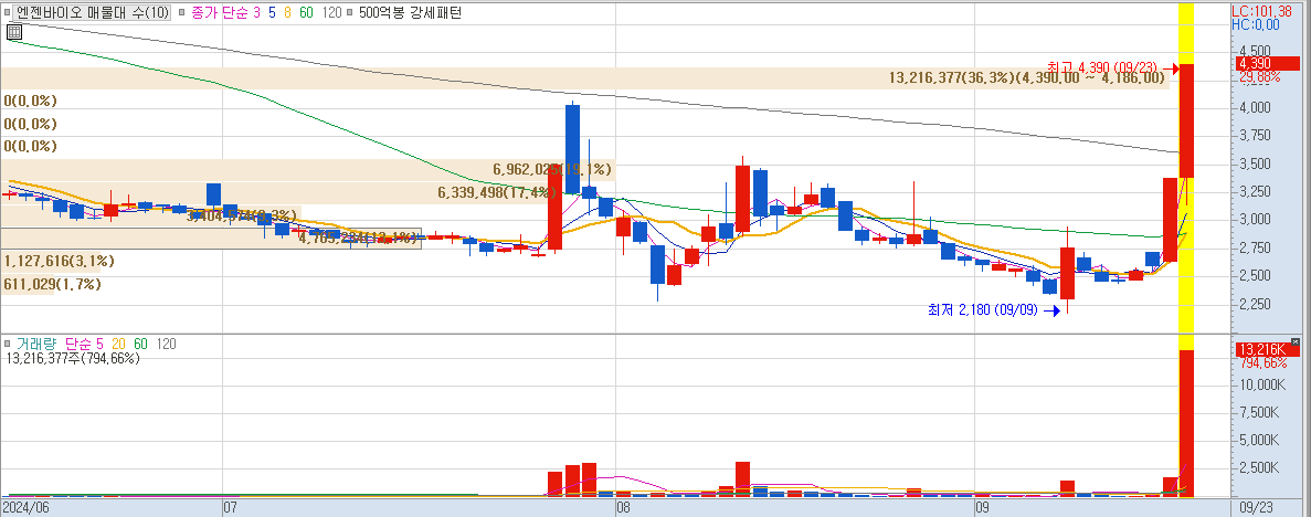 - 엔젠바이오는 전날 암 재발 예측 진단 제품 출시로 상한가를 기록한 데 이어, 오늘은 변이 분석 소프트웨어 관련 특허를 출원했다는 뉴스로 다시 상승했습니다.