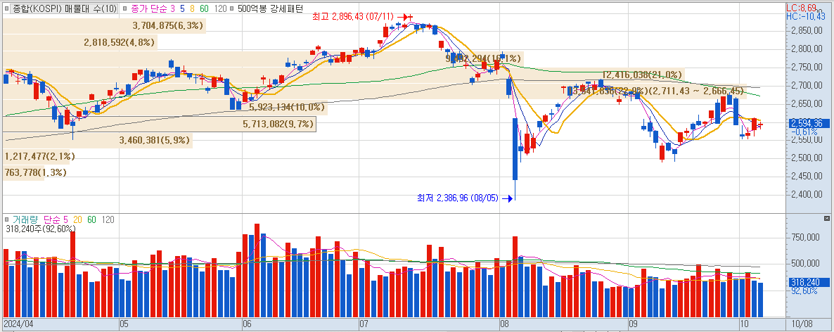 - 지수 하락: 지수는 소폭 하락하며 안정적인 조정 국면으로 진입. 투자 비중 조절과 일부 익절 포인트를 찾아 매도하는 전략이 유리함.