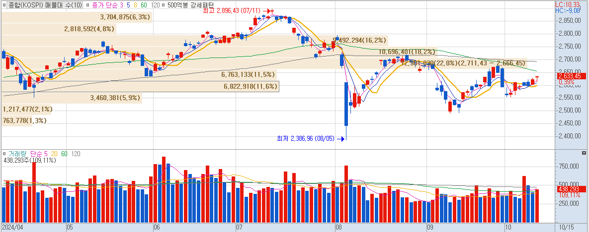 - 코스피: 장 초반 다소 하락하다가 회복하며 소폭 상승 마감.