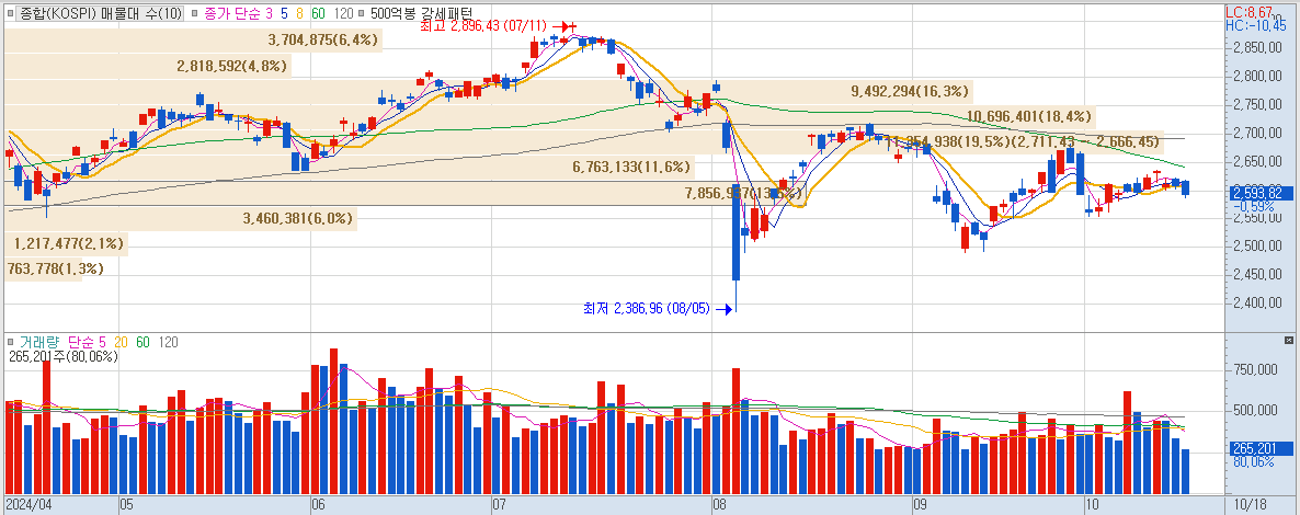 - 현재 지수가 하락 추세로 접어들고 있어, 종목당 비중을 줄이고 분할 매수 전략이 유리해 보입니다.