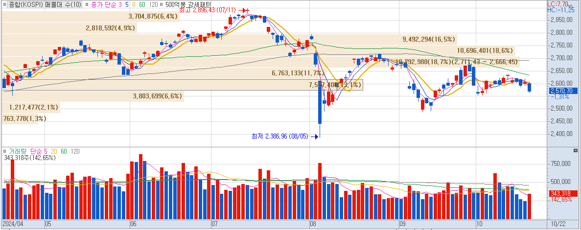 - 외국인과 기관의 매도세가 강해졌으며, 개인 투자자만 매수에 나서고 있는 상황이라 전체적인 시장 분위기는 위험도가 높은 편입니다.