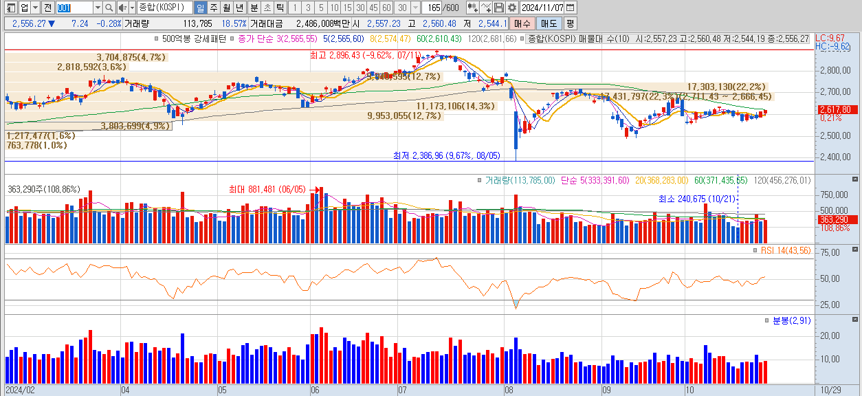 - 반등 배경: 오늘 시장은 당정에서 반도체 육성과 금융투자소득세 폐지 내용을 포함한 민생 입법을 정기 국회에서 처리하기로 발표하면서 지수가 반등했습니다. 오전까지 하락세였던 지수는 이 발표 이후 상승으로 전환되었습니다.